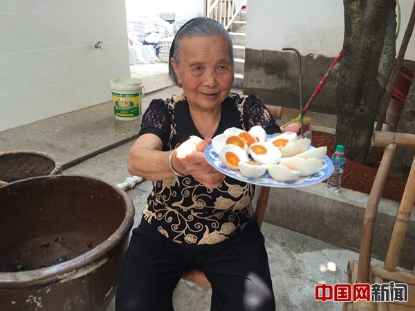 瑞金市壬田鎮(zhèn)鳳崗村,“鴨蛋代言人”廖奶奶向大家展示自家制作的鴨蛋。中國(guó)網(wǎng)記者 尚陽(yáng) 攝