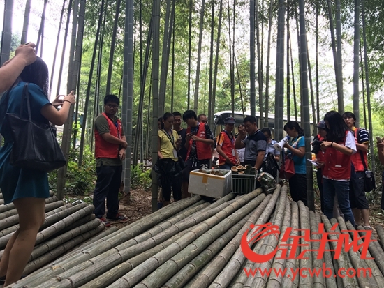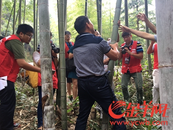 負(fù)責(zé)人向媒體記者展示綠竹酒砍伐過程。
