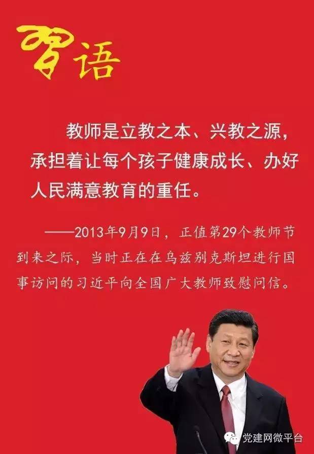 2013年9月9日,習(xí)近平正在烏茲別克斯坦進(jìn)行國事訪問,時值第29個教師節(jié)到來之際,他向全國廣大教師致慰問信。信中,他向全國廣大教師致以節(jié)日問候,祝他們身體健康、工作順利、生活幸福!要求“全社會要大力弘揚尊師重教的良好風(fēng)尚,使教師成為最受社會尊重的職業(yè)。”