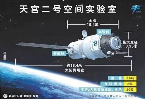 “天宮二號(hào)”是我國(guó)第一個(gè)真正意義上的太空實(shí)驗(yàn)室,采用實(shí)驗(yàn)艙和資源艙兩艙構(gòu)型,全長(zhǎng)10.4米,最大直徑3.35米,太陽(yáng)翼展寬約18.4米,重8.6噸,設(shè)計(jì)在軌壽命2年,在“天宮一號(hào)”目標(biāo)飛行器備份產(chǎn)品的基礎(chǔ)上,為滿足推進(jìn)劑補(bǔ)加驗(yàn)證試驗(yàn)需要,對(duì)推進(jìn)分系統(tǒng)進(jìn)行了適應(yīng)性改造;為滿足中期駐留需要,對(duì)載人宜居環(huán)境進(jìn)行了重大改善,具備支持2名航天員在軌工作、生活30天的能力!疤鞂m二號(hào)”裝載了空間冷原子鐘等14項(xiàng)應(yīng)用載荷,以及失重心血管功能研究等相關(guān)航天醫(yī)學(xué)實(shí)驗(yàn)設(shè)備,配備在軌維修技術(shù)驗(yàn)證裝置、機(jī)械臂操作終端等在軌維修試驗(yàn)設(shè)備,將開展空間科學(xué)及技術(shù)試(實(shí))驗(yàn)。