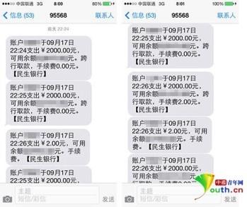 中國青年網(wǎng)北京9月19日電(見習記者 吳陽) 9月17日晚,家住北京市昌平區(qū)的趙先生正準備休息,突然收到一條短信:“賬戶****,于9月17日22:24分轉(zhuǎn)出2000元,余額……,跨行轉(zhuǎn)款。”趙先生心中一驚,自己的銀行卡正在往外轉(zhuǎn)錢,而這張銀行卡就在自己手上!趙先生隨即報警,并撥通了民生銀行的客服電話,進行掛失。
