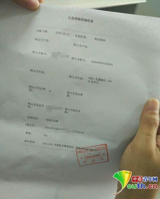 《交易明細詳細信息》顯示“轉(zhuǎn)入方帳號”為“9502000001000001”,“轉(zhuǎn)出方憑證號碼”一欄顯示的為趙先生的銀行卡號,轉(zhuǎn)入方行名為“0301-交通銀行1000-北京市”,交易狀態(tài):“交易已過賬”,“通道:PES”。最下邊一欄備注信息:“03011000,華普超市潘家園店(朝陽區(qū)華威里西8號)”。工作人員稱,10筆轉(zhuǎn)賬的明細信息相同。