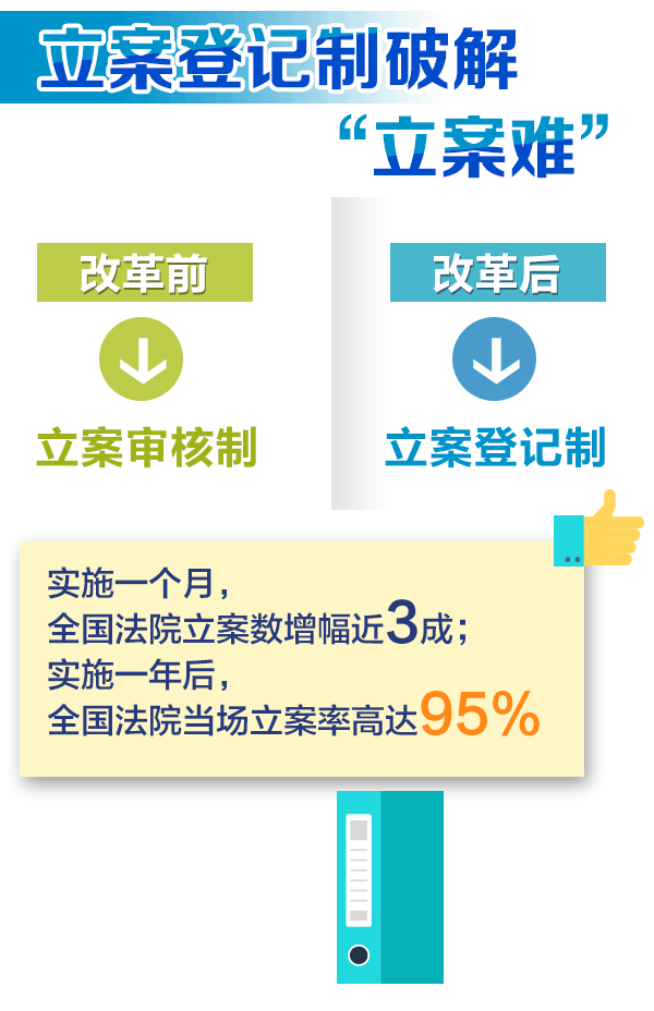 【進(jìn)展成效】去年5月1日,立案登記制改革在全國法院正式實(shí)施后,效果立竿見影。僅一個(gè)月,全國法院立案數(shù)增幅近三成,其中,行政案件數(shù)量同比增長221%;一年后,全國法院收案數(shù)增長28%,當(dāng)場立案率高達(dá)95%;2016年上半年,全國法院新收各類案件1002.9萬件,首次突破千萬件。有案不立、拖延立案、年底不收案等現(xiàn)象基本消失。