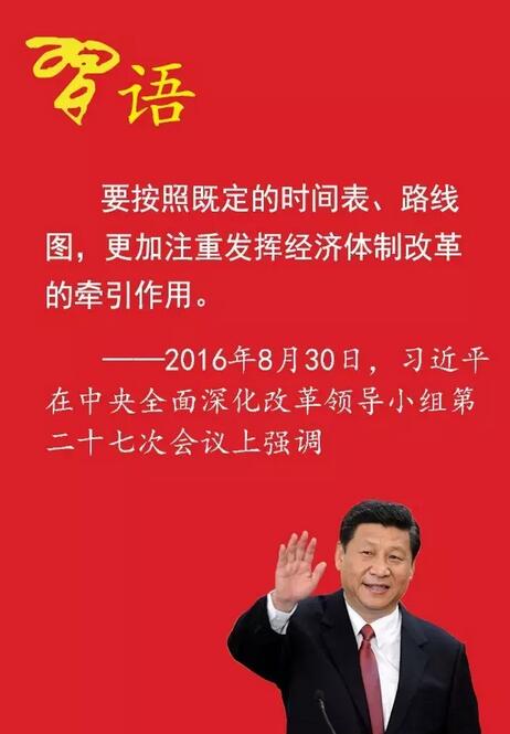 2016年8月30日,在中央全面深化改革領(lǐng)導(dǎo)小組第二十七次會議上,習(xí)近平強調(diào),要按照既定的時間表、路線圖,更加注重發(fā)揮經(jīng)濟體制改革的牽引作用。
