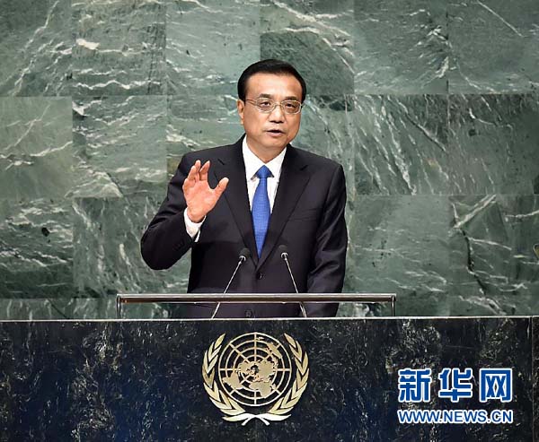 9月21日,國務(wù)院總理李克強在紐約聯(lián)合國總部出席第71屆聯(lián)合國大會以“可持續(xù)發(fā)展目標(biāo):共同努力改造我們的世界”為主題的一般性辯論并發(fā)表題為《攜手建設(shè)和平穩(wěn)定可持續(xù)發(fā)展的世界》的重要講話。新華社記者 李濤 攝