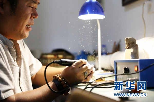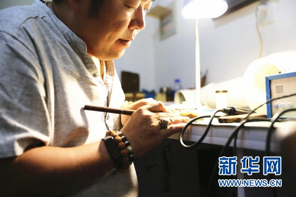 新華網(wǎng)北京9月29日電(記者 李旭)一把雕刻刀、一顆琥珀,他在工作室里專心于創(chuàng)作。80后的他身量微胖,聲音洪亮,坐在記者對面手拿雕刻刀在琥珀上雕刻紋樣,厚薄有度,剛?cè)嵯酀,精致的紋案慢慢顯現(xiàn)出來。每一塊琥珀都是大自然的精靈,而琥珀雕刻的背后凝聚著中國匠人的堅守、熱枕和執(zhí)著。