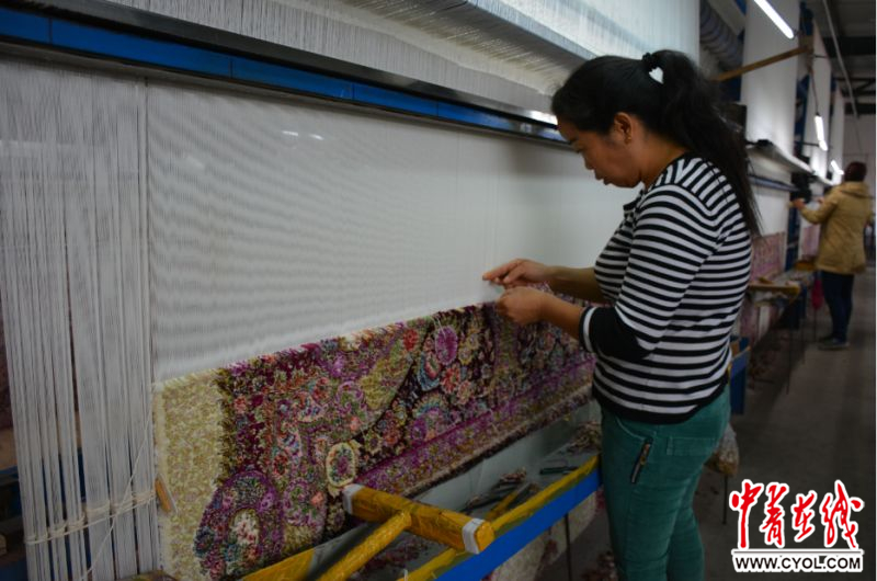宇翔地毯廠的生產(chǎn)車間內(nèi),數(shù)十名女工正在加工手工地毯。這項工作可以帶給她們每個月2000元左右的收入。