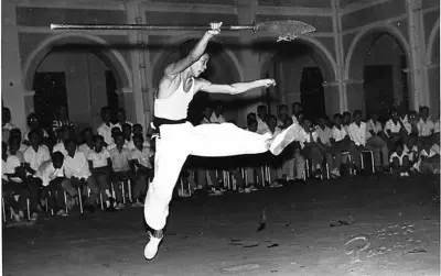 二十世紀(jì)六十年代,柿山結(jié)義堂的弟子表演武術(shù)器械。