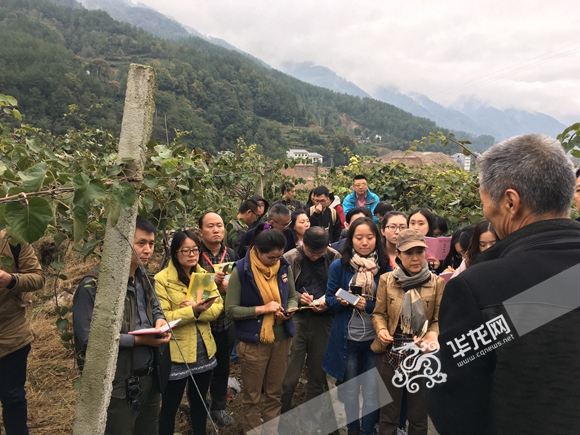 光明村黨支部書記龐仁斌向采訪團介紹獼猴桃種植基地情況。 記者 黃宇 攝
