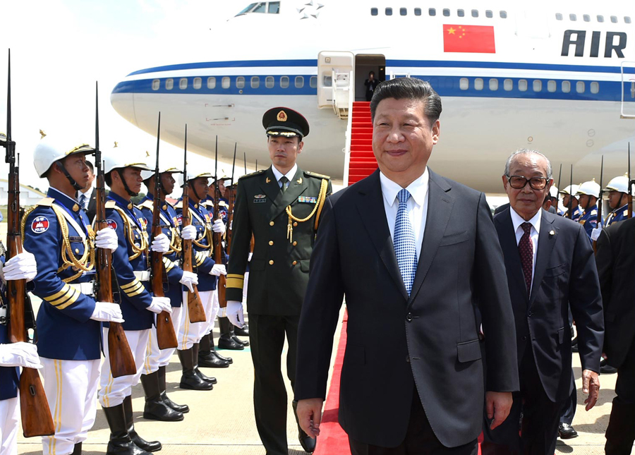 10月13日,國家主席習(xí)近平乘專機(jī)抵達(dá)金邊國際機(jī)場,開始對(duì)柬埔寨王國進(jìn)行國事訪問。柬埔寨副首相兼王宮事務(wù)大臣貢桑奧親王和夏卡朋親王、阿倫公主等在舷梯旁熱情迎接習(xí)近平主席。新華社記者 謝環(huán)馳 攝