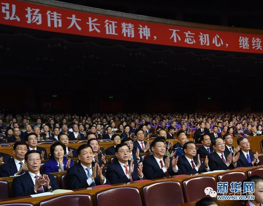 圖為:2016年10月19日,紀念紅軍長征勝利80周年文藝晚會《永遠的長征》在北京人民大會堂舉行。習近平、李克強、張德江、俞正聲、劉云山、王岐山、張高麗等黨和國家領導人,與首都3000多名群眾共同觀看演出。