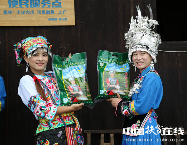 美麗的湖南省花垣縣十八洞村姑娘展示苗嶺貢米。王振紅攝