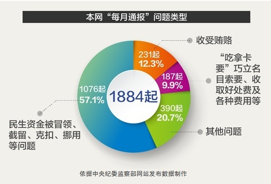 16次“每月通報”的1884起問題中,涉及民生資金被冒領(lǐng)、截留、克扣、挪用等問題共1076起,占57.1%。