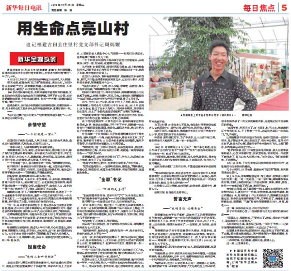 《經(jīng)濟(jì)日?qǐng)?bào)》10月21日則以《村民的好支書》為題,報(bào)道了“忠誠(chéng)的共產(chǎn)黨人”“群眾的貼心人”“脫貧的領(lǐng)路人”周炳耀的事跡。通訊說(shuō):“在周炳耀的帶領(lǐng)下,莊里村近幾年累計(jì)發(fā)展種植花菇166.9萬(wàn)袋、雞腿菇40.5萬(wàn)袋、猴頭菇75萬(wàn)袋、白木耳148萬(wàn)袋、水蜜桃200畝,全村124戶414人基本全部過(guò)上了小康生活!