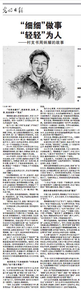 10月20日,《光明日?qǐng)?bào)》以《“細(xì)細(xì)”做事 “輕輕”為人》為題,敘述了周炳耀的故事。通訊指出,共產(chǎn)黨員周炳耀把短暫的一生視為一個(gè)“解題”過(guò)程:群眾出了“題目”,他就一筆一畫地認(rèn)真解答;群眾不出“題目”,他就自己找出“題目”,再用心解答,目的是盡量讓群眾少遇到“題目”。