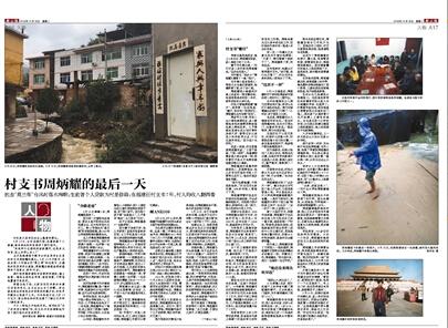 其中,《人民日?qǐng)?bào)》10月24日的長(zhǎng)篇通訊《暖心村支書 一心為鄉(xiāng)親》記敘了周炳耀遇難的過(guò)程和生前一心為民、一心為公的感人事跡。通訊分四部分,分別是“傷心——疏通橋洞時(shí),他被湍急洪水中的竹竿頂入水中,瞬間被吞噬”“貼心——一樁樁,一件件,村里人記著他的好”“公心——他對(duì)村子發(fā)展有思路,大伙信得過(guò)他,愿意跟著他干”“信心——努力接好班,要像他那樣心里裝著全村人”。