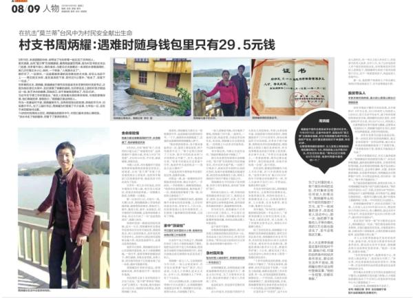 《新京報(bào)》的通訊則回憶了周炳耀犧牲前最后一天的行蹤,《南方都市報(bào)》聚焦在周炳耀的清正廉潔和大公無(wú)私。