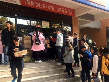 2016年11月10日上午,鄭州龍子湖高校園區(qū)的河南經(jīng)貿(mào)職業(yè)學(xué)院內(nèi),網(wǎng)購的大學(xué)生們來到校園里的快遞取貨點(diǎn),排隊(duì)領(lǐng)取自己的網(wǎng)購商品。光棍...