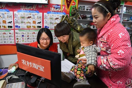 11月10日,在河南省孟州市東韓村農(nóng)村淘寶服務(wù)站,村淘合伙人馬嬋娟(左一)在幫村民們選購商品。新華社記者 李博/攝