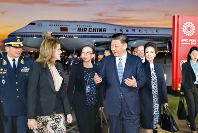 當(dāng)?shù)貢r(shí)間11月18日,國家主席習(xí)近平抵達(dá)利馬,出席亞太經(jīng)合組織第二十四次領(lǐng)導(dǎo)人非正式會(huì)議并對(duì)秘魯共和國進(jìn)行國 事訪問。習(xí)近平和夫人彭麗媛受到秘魯副總統(tǒng)阿勞斯等熱情迎接。新華社記者鞠鵬攝
