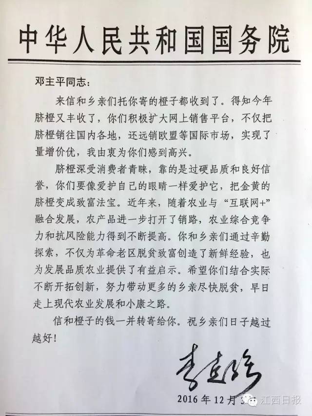 李克強(qiáng)總理給瑞金市黃柏鄉(xiāng)果農(nóng)鄧主平的回信