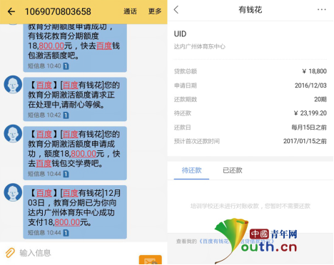 隨后程女士將手機(jī)還給小宜,開始和她聊天。當(dāng)時手機(jī)里不斷收到短信,小宜說自己出于禮貌,聊天期間沒有看手機(jī)。回到家才發(fā)現(xiàn),自己收到的是貸款短信。自己的賬號通過百度錢包貸了18800元的教育分期貸款,需要分期償還2.3萬元。