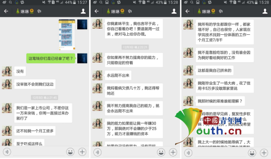 小宜發(fā)現(xiàn)以后,立即與程女士聯(lián)系。而程女士則表示,自己是一家上市公司,“不差你這一萬”,小宜可以周一來退貸款。隨后程女士給小宜講起了自己的和自己學(xué)生的勵志故事。內(nèi)容包括“我媽看病欠債幾十萬,我還得幫她還”,“我不努力提高我自己的能力,就永遠(yuǎn)爬不出來”,“我的能力如果能讓我一年賺30萬,那我絕不會賺的少于25萬,能力才是賺錢的資本”!拔宜械膶W(xué)生都跟你一樣,都家境不好,自己也很窮,人家現(xiàn)在學(xué)完技術(shù)找到一份體面的工作一個工資7/8千”……