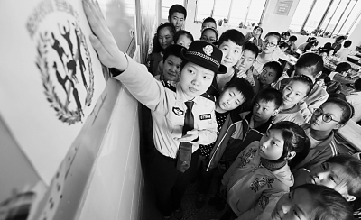 2016年10月17日,江蘇東?h一民警在縣實(shí)驗(yàn)小學(xué)教育集團(tuán)內(nèi)向?qū)W生講解在遭遇“校園欺凌”時(shí)應(yīng)如何自我保護(hù)及應(yīng)對(duì)。張開(kāi)虎攝/光明圖片