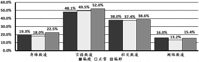 ●數(shù)據(jù)分析結(jié)果顯示,言語(yǔ)欺凌的發(fā)生率最高,有將近一半(49.6%)的初中生遭受過(guò)言語(yǔ)形式的校園暴力;其次為社交欺凌,有37.7%的初中生遭遇過(guò)校園內(nèi)社會(huì)交往上的欺凌;而有19.1%的初中生在校園里遭受過(guò)身體上的暴力傷害;網(wǎng)絡(luò)欺凌作為校園暴力的新形式,其發(fā)生率也達(dá)到了14.5%。