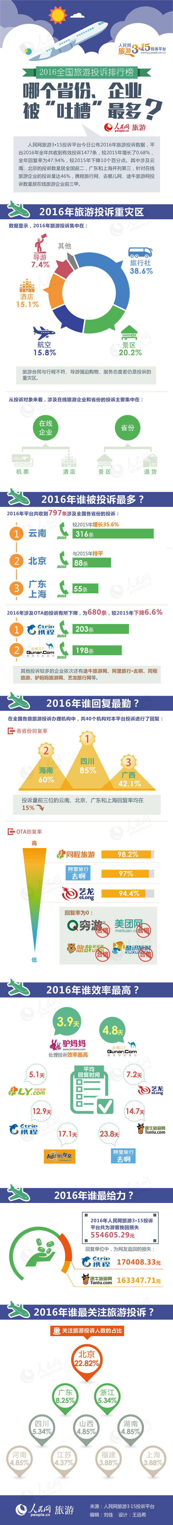 人民網(wǎng)北京1月11日電 (劉佳)人民網(wǎng)旅游3·15投訴平臺今日公布2016年旅游投訴數(shù)據(jù),平臺2016年全年共收到有效投訴1477條,較2015年增長了0.68%,全年回復率為47.94%,較2015年下降10個百分點。其中涉及云南、北京的投訴數(shù)量居全國前二,廣東和上海并列第三,針對在線旅游企業(yè)的投訴量達46%,攜程旅行網(wǎng)、去哪兒網(wǎng)、途牛旅游網(wǎng)投訴數(shù)量居在線旅游企業(yè)前三甲。