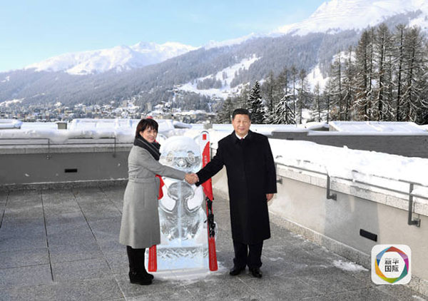 1月17日,國家主席習近平同瑞士聯邦主席洛伊特哈德在達沃斯共同啟動中瑞旅游年。兩國元首在熊貓冰雕像和印有中瑞兩國國旗及“中瑞旅游年”字樣的滑雪板旁合影留念。新華社記者饒愛民攝
