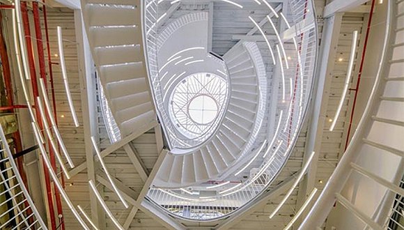 建筑師把4層的天花板一一打穿,屋頂新開了一個(gè)穹頂,將平均直徑3.6米的圓光從四層引入一層,于是就有了光。老廠房現(xiàn)在是一個(gè)聯(lián)合辦公場(chǎng)所,服務(wù)于小團(tuán)隊(duì)及獨(dú)立工作者,也成為城市舊空間改造的經(jīng)典案例之一。