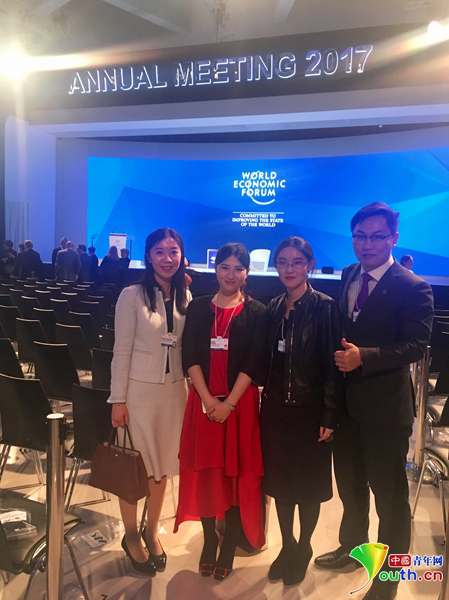 1月17日,陳瀟函、董博、過曉茜和張開迪(從左至右)在世界經(jīng)濟(jì)論壇2017年年會(huì)現(xiàn)場合影。董博供圖