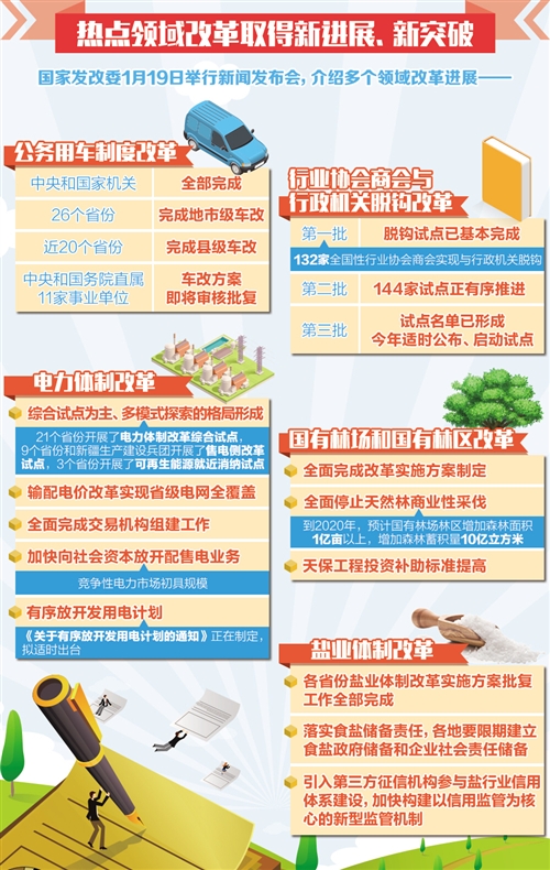 價格改革方面,電力、成品油、天然氣、水等資源性產(chǎn)品價格改革取得新成效,醫(yī)療服務、鐵路客運等服務價格改革也取得重要進展。國有林場林區(qū)、電力體制、鹽業(yè)體制等重要行業(yè)改革舉措落地精準、進展順利;對外開放方面,貫徹《中共中央 國務院關于構(gòu)建開放型經(jīng)濟新體制的若干意見》,統(tǒng)籌推進利用外資、對外投資等重點改革,加快完善對外開放體制機制;生態(tài)文明體制改革方面,生態(tài)文明目標評價考核、設立統(tǒng)一規(guī)范的生態(tài)文明試驗區(qū)等重大制度取得突破,進一步完善主體功能區(qū)制度,穩(wěn)步推進國家公園體制試點,生態(tài)文明制度體系進一步健全。此外,新型城鎮(zhèn)化、創(chuàng)新驅(qū)動發(fā)展、社會事業(yè)等重點領域改革也取得了新的進展和成效,對激發(fā)市場主體活力和社會創(chuàng)造力、培育經(jīng)濟發(fā)展新動能發(fā)揮重要作用。