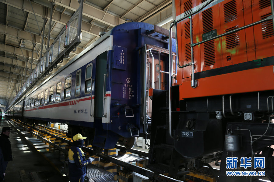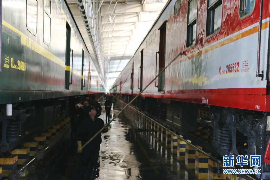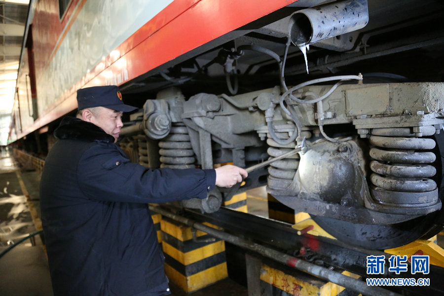 孫立偉工作28年,在崗位上過(guò)了28個(gè)春節(jié)(新華網(wǎng)發(fā) 曹楨 攝) 新華網(wǎng)呼和浩特1月20日電(曹楨)2017年春運(yùn)開(kāi)始以來(lái),每天有19列火車(chē)共342節(jié)車(chē)廂從呼和浩特火車(chē)站開(kāi)出。每一節(jié)?吭谡九_(tái)的車(chē)廂,都是剛剛從火車(chē)“醫(yī)院”里接受了“醫(yī)生”的全面“體檢”后開(kāi)出的,以保障每一位旅客都能安全回家。 呼鐵局包頭車(chē)輛段呼和運(yùn)用車(chē)間,負(fù)責(zé)火車(chē)車(chē)輛的安全檢修。檢修錘、手電筒和一雙銳利的眼睛,是檢車(chē)員必備的工具。 呼和運(yùn)用車(chē)間黨總支書(shū)記孫立偉干了28年檢修工作,只要進(jìn)了車(chē)間大門(mén),手里就永遠(yuǎn)攥著手電。他說(shuō),一個(gè)合格的檢車(chē)員,工作時(shí)三個(gè)工具必須同時(shí)落在一個(gè)點(diǎn)上。就著手電的光,檢修錘敲敲螺絲、彈簧,檢車(chē)員聽(tīng)聲音就能判斷出這一處是否有問(wèn)題,而眼睛要同時(shí)找出問(wèn)題。 “平安出行、有序出行、溫馨出行”,2017年春運(yùn)期間,運(yùn)用車(chē)間院里掛著的這條標(biāo)語(yǔ),也是檢車(chē)員們的工作目標(biāo)。 孫立偉說(shuō),春運(yùn)開(kāi)始前一個(gè)月,運(yùn)用車(chē)間將所有列車(chē)車(chē)廂進(jìn)行了檢修,共605輛。火車(chē)運(yùn)行中,都有檢車(chē)員隨車(chē),每隔三小時(shí)進(jìn)行一次檢查。到站后,火車(chē)會(huì)開(kāi)進(jìn)車(chē)間的整備庫(kù)接受檢查,一列火車(chē)有100多人“服務(wù)”,檢修完成后再進(jìn)行清洗,隨后加掛車(chē)頭開(kāi)出運(yùn)用車(chē)間,開(kāi)往火車(chē)站開(kāi)啟下一段旅程。 今年春節(jié),將有170名檢車(chē)員堅(jiān)守崗位,為出行的旅客護(hù)航。參加工作28年的孫立偉,也在崗位上過(guò)了28個(gè)春節(jié)。 由于春運(yùn)客流量較南方城市少,呼和浩特鐵路局每年都要向南方的鐵路局支援車(chē)輛。2017年春運(yùn),向武漢鐵路局支援了7列火車(chē),每列18節(jié)車(chē)廂;疖(chē)開(kāi)往武漢前,運(yùn)用車(chē)間同樣對(duì)所有車(chē)廂進(jìn)行了全面檢修。孫立偉說(shuō),這7列火車(chē),每一列都有7名呼鐵局的乘務(wù)員隨車(chē),春節(jié)都要在火車(chē)上過(guò)。比起自己,這些遠(yuǎn)離家鄉(xiāng)的乘務(wù)員們更加辛苦。