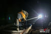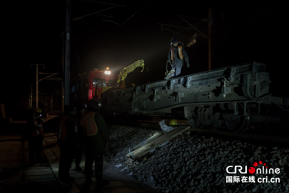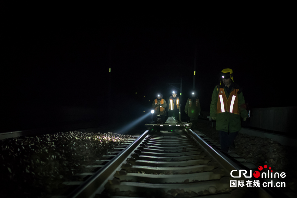 深夜,位于山西省陽曲縣境內(nèi)的太行山深處,石家莊工務(wù)段東凌井車間的養(yǎng)路工人們背好設(shè)備,在海拔1270米的石太客專鐵軌上忙碌著。石太客運專線是我國首批開通運營的山區(qū)有砟高速鐵路,線路橫跨太行山脈,自然環(huán)境復雜,海拔最低77米,最高1272米,東凌井保養(yǎng)點便位于最高點上。圖為工人們將養(yǎng)護用的工具和設(shè)備放到軌道車上。 -