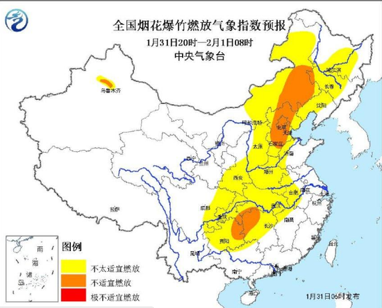 1月31日08時至2月1日08時,華北中南部、黃淮西北部、陜西關中等地空氣污染氣象條件為3級,部分地區(qū)4級。華北中北部等地不適宜燃放煙花爆竹。全國其余大部地區(qū)空氣污染氣象條件較好,有利于污染物的擴散。