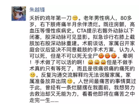 作為醫(yī)生,朱越鋒的心情很糟糕,“很可惜的,(病人)昨天剛剛過(guò)來(lái),我就想安排今天急診手術(shù),但萬(wàn)萬(wàn)沒(méi)想到是這樣的結(jié)果。如果不截肢,一旦感染擴(kuò)散,幾天人就沒(méi)了。如果沒(méi)有繼發(fā)感染,或許有幾個(gè)月好拖,但也是等死,而且最后是很痛很痛地痛死的!