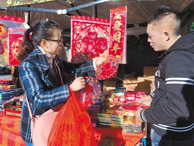圖為今年選擇在林芝過新春佳節(jié)的唐女士在年貨市場挑選窗花。