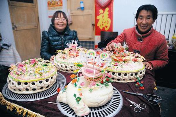 王銀菊(左)看著做成的花饃,高興得合不攏嘴。