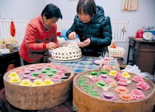 待蒸好的各色面花冷卻后,插在底座上進(jìn)行裝飾。