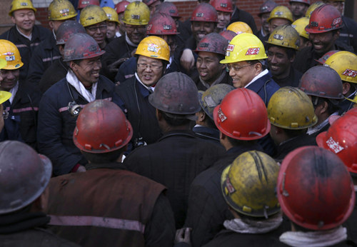 在滿臉黝黑的礦工人叢中,總理緊緊握著他們的手說:“你們自己常年在黑暗的井下工作,卻照亮了他人。有人說你們是煤黑子,我說你們是煤亮子。煤炭工人不僅是山西的脊梁,也是國家的脊梁!