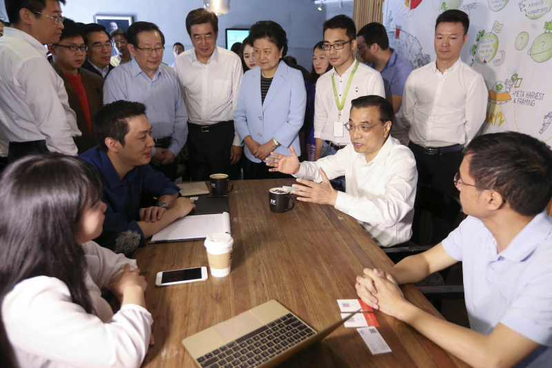 2015年5月7日,李克強(qiáng)來(lái)到中關(guān)村創(chuàng)業(yè)大街3W咖啡。他坐下來(lái)與年輕人邊喝咖啡邊聊創(chuàng)業(yè)。蜂擁圍攏過(guò)來(lái)的創(chuàng)業(yè)者爭(zhēng)搶著向總理介紹各自的項(xiàng)目。聽到大家各種奇思妙想的創(chuàng)意,總理感嘆道:“這里精彩紛呈,什么想法都有!真正知道社會(huì)需求的是大眾,這正是大眾創(chuàng)業(yè)的精髓所在!保ㄙY料圖)