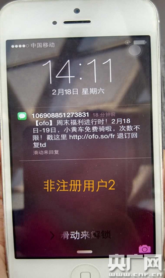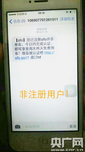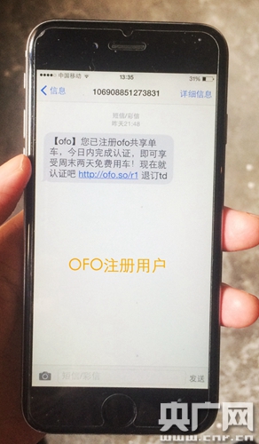 記者從這名未接觸過共享單車的市民手機上看到,短信內容為:“您已注冊OFO共享單車,今日內完成認證,即可享受周末兩天免費用車!現(xiàn)在就認證吧”還附上了一個鏈接,而這一鏈接點進去,其實是OFO單車的注冊頁面。