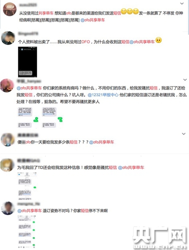 記者就類似情況在微博上進行檢索:上海一微博用戶表示:“從沒使用過共享單車,想知道OFO是哪來的渠道給我們發(fā)送短信,發(fā)一條就算了,不停發(fā)。廣州一微博用戶質疑OFO共享單車:“我的個人資料是被出賣了?從來沒用過OFO,為什么會收到這些短信?”四川成都市民發(fā)微博投訴OFO共享單車說:“系統(tǒng)有病嗎?不用你們的東西,給我發(fā)騷擾短信,我退訂了還給我發(fā),你們公司搞什么?坑人呀!”這位用戶還轉發(fā)給了12321”網(wǎng)絡不良與垃圾信息舉報受理中心”,表示發(fā)了退訂短信仍被騷擾,想問怎么處理?“挺急的,在線等,希望不要再騷擾更多人”。