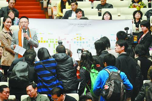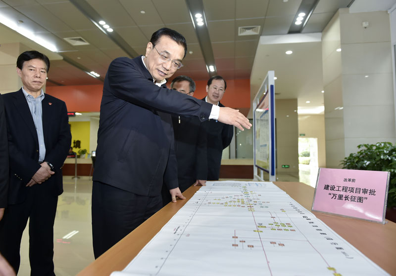 圖片說明:“這些多余的審批項目都該‘打叉’!把它送進(jìn)歷史!2015年1月5日,李克強在廣東自貿(mào)區(qū)南沙片區(qū),指著一張長4米、耗時近800天的投資項目審批流程圖說。得知改革后審批時間縮短為原來的1/5,總理說,“萬里審批圖”制約市場活力,容易滋生腐敗。廣東要繼續(xù)先行先試,為“三規(guī)合一”等改革探路。
