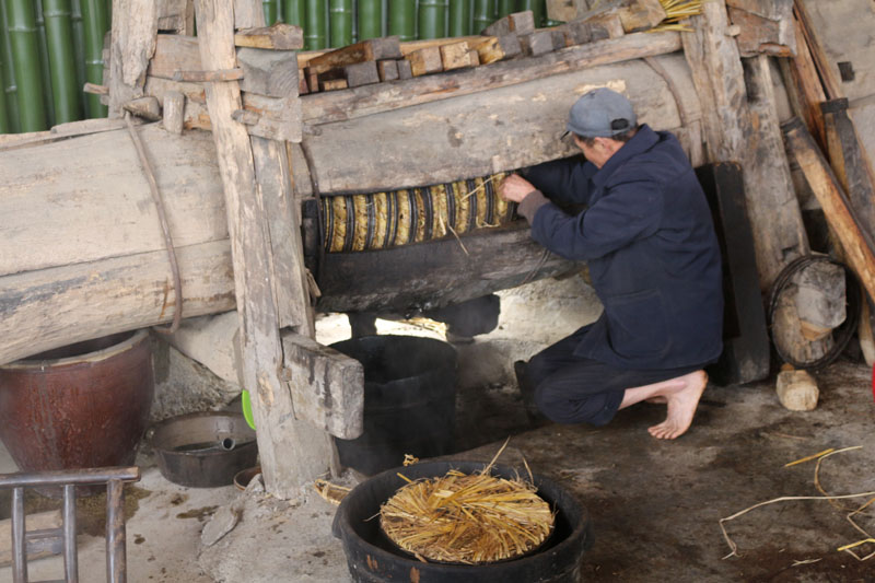當(dāng)?shù)剞r(nóng)民在禾田山谷打工。圖為人工榨菜籽油。