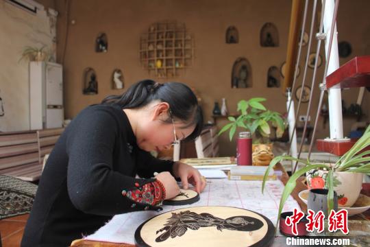 圖為張燕林在客棧中雕刻敦煌壁畫主題的木版畫。 徐雪 攝