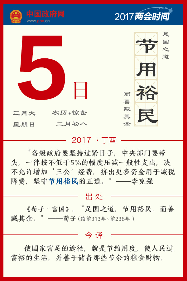 3月5日,李克強總理在作《政府工作報告》時指出,各級政府要堅持過緊日子,中央部門要帶頭,一律按不低于5%的幅度壓減一般性支出,決不允許增加“三公”經(jīng)費,擠出更多資金用于減稅降費,堅守節(jié)用裕民的正道。