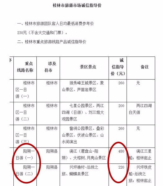 “此刻”注意到,2016年12月27日,桂林市旅行社協(xié)會(huì)發(fā)布了《桂林市旅行社投訴處理辦法》(試行)。同時(shí),桂林市旅游發(fā)展委員會(huì)在其官方主頁上公布了16條旅游線路的誠(chéng)信指導(dǎo)價(jià)。涉及陽朔的8條線路中有兩條為一日游,指導(dǎo)價(jià)分別為480元和220元,是李女士參繳納團(tuán)費(fèi)的5倍還多。